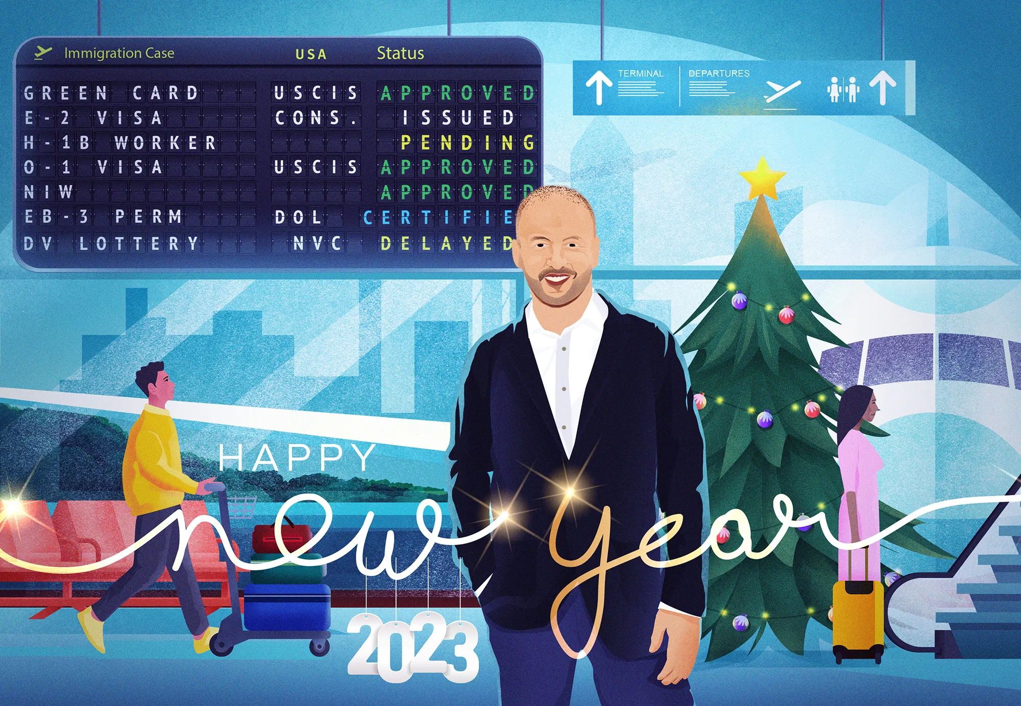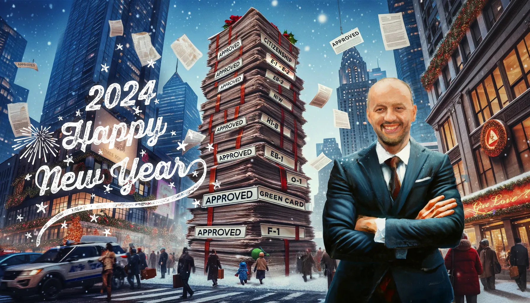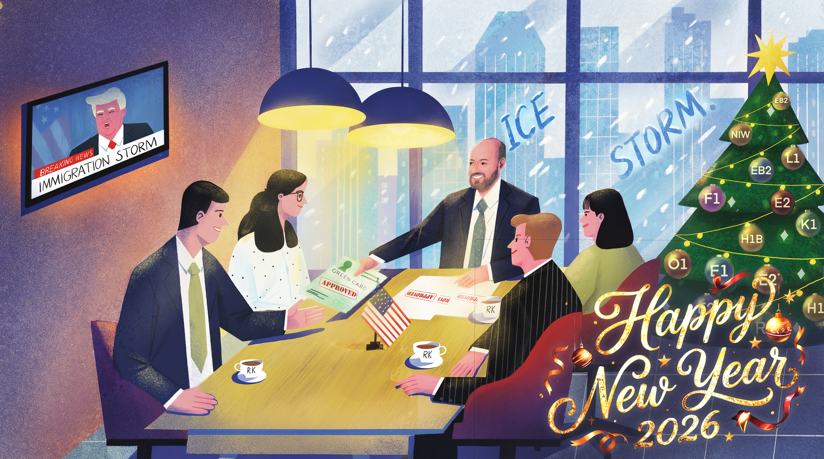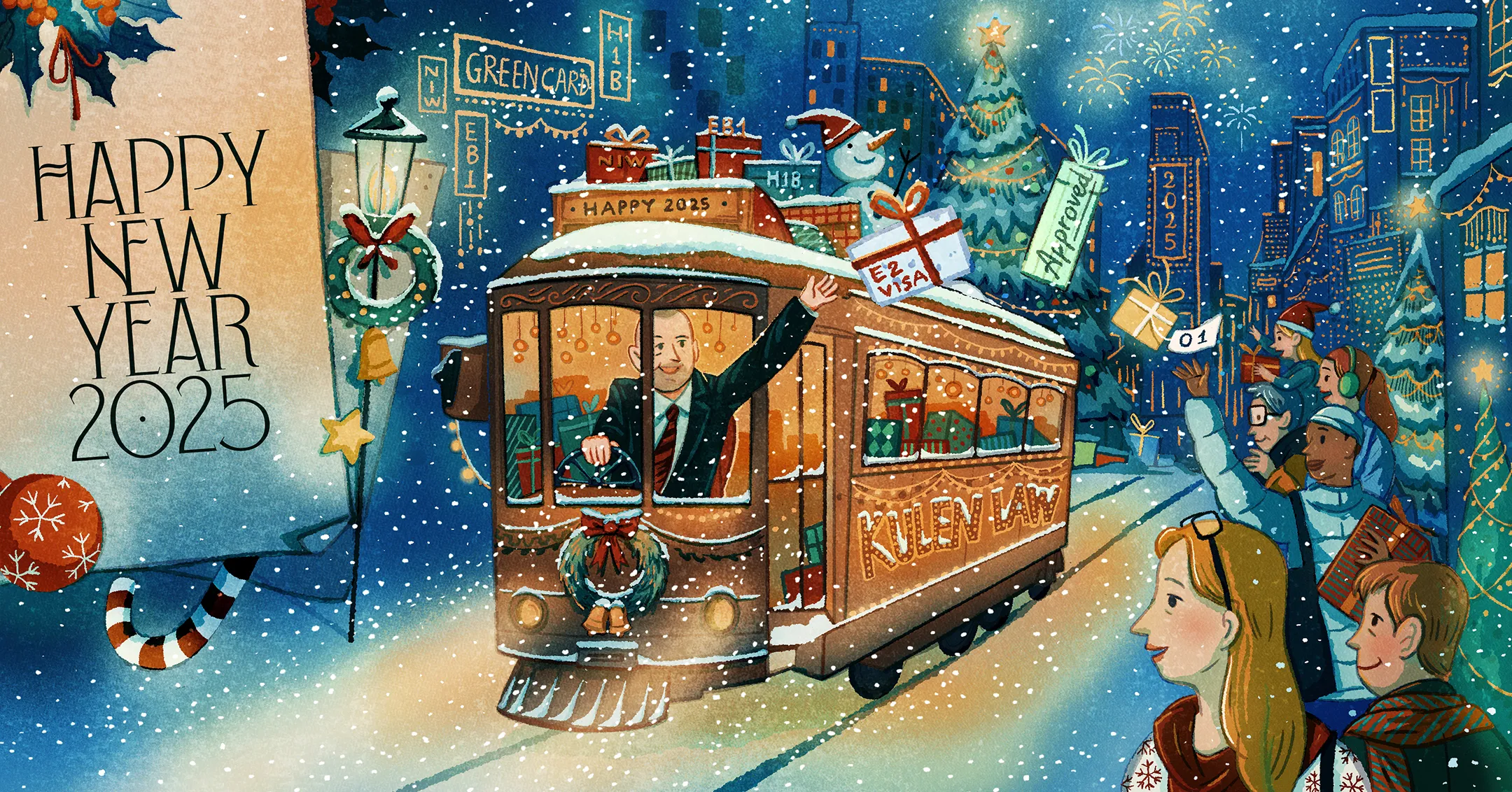 Each year, Kulen Law Firm commissions an illustrator to create an original Holiday/New Year Card for our clients and community. It’s a tradition we genuinely enjoy — a chance to pause, reflect on the year’s realities in immigration (the challenges, the unpredictability, the wins), and tell that story in a warm, creative, and uniquely New York way.